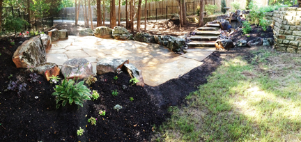 Below are examples of dry stacker rock, a mix of dry stack rock and moss boulders, paver stone patios, and huge paver steps and walkways, accented with flower beds: