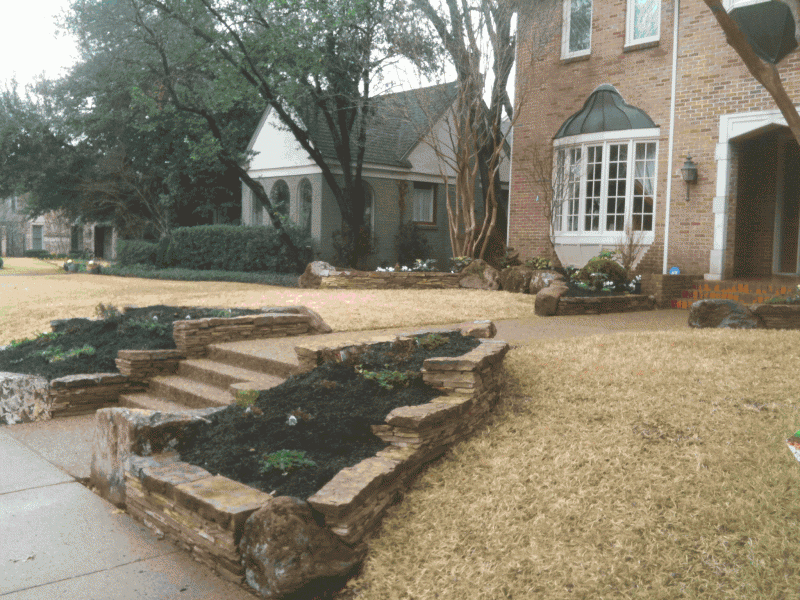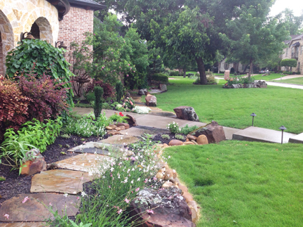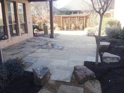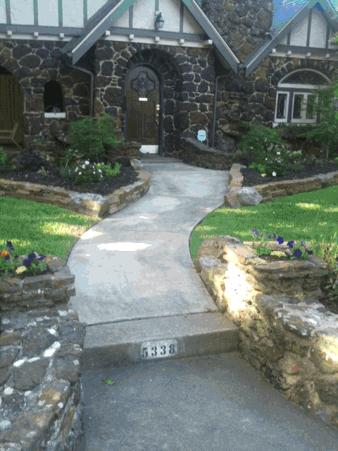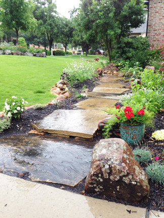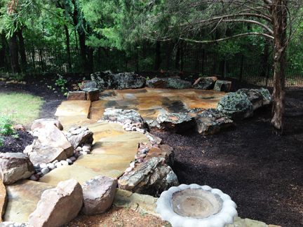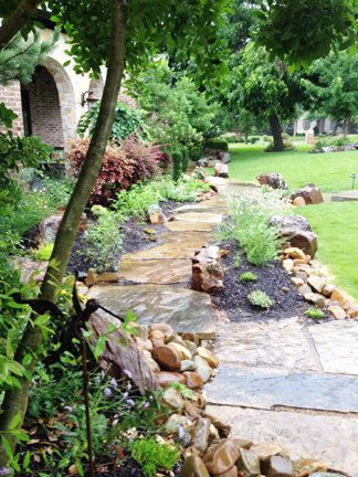 Below are examples of dry stacker rock, a mix of dry stack rock and moss boulders, paver stone patios, and huge paver steps and walkways, accented with flower beds: