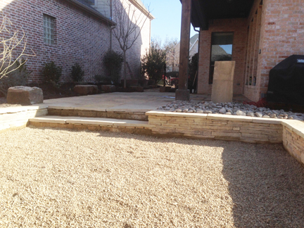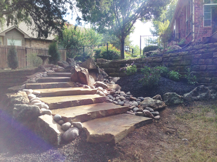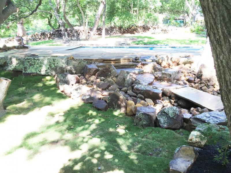 Two solutions in one below: Extending a pool patio area and also creating a natural retaining wall to help with erosion. The stone steps allow you to access the yard below. Giving it a natural look and appealing landscape.
